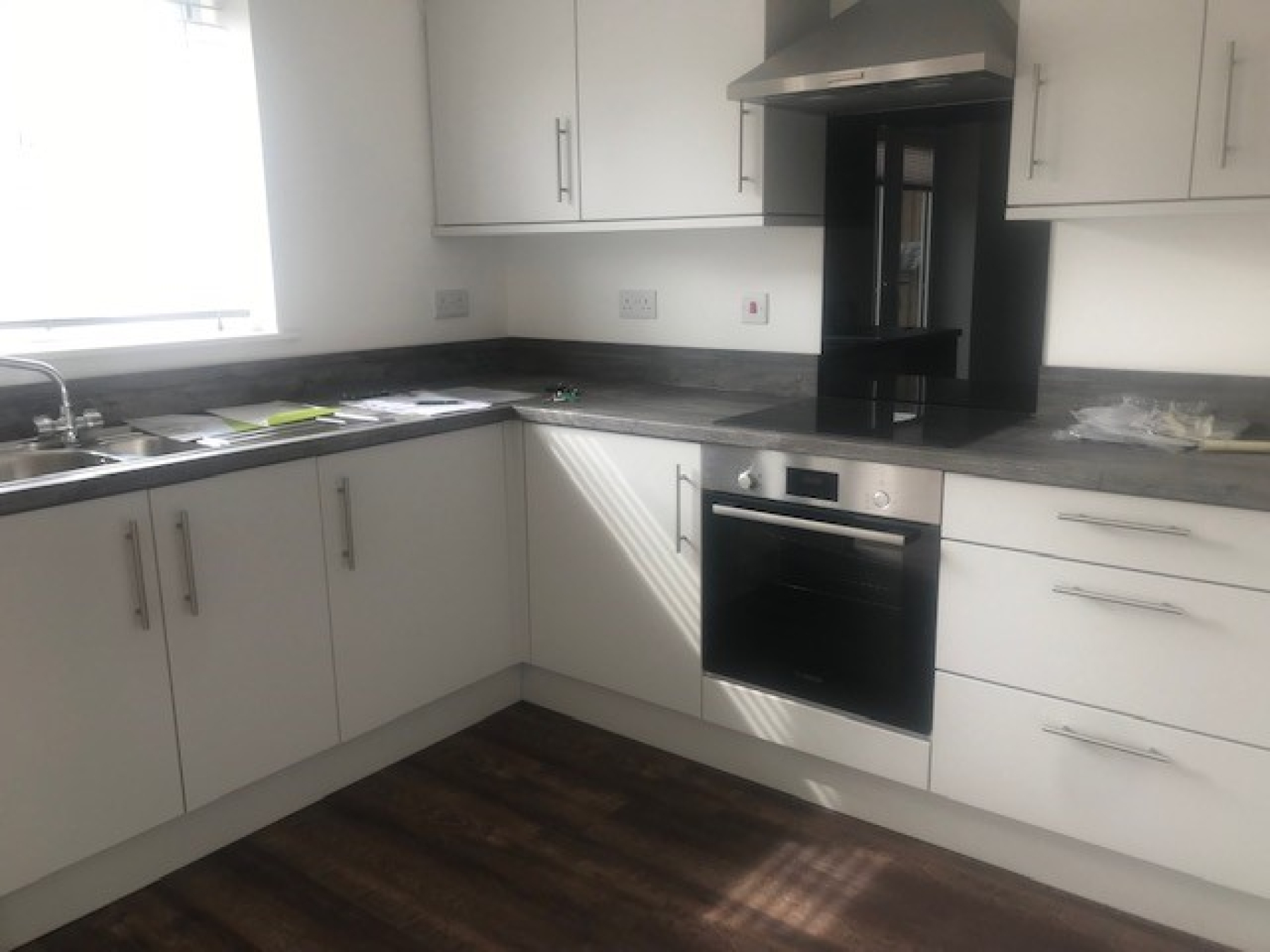 electric oven, ceramic hob, and chimney style extractor hood. Space for a dining table. Patio doors leading to