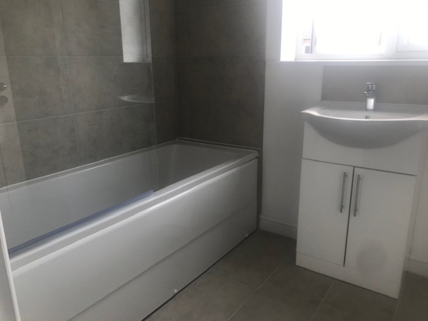 Family bathroom with modern three-piece suite including a vanity unit sink and shower over bath with